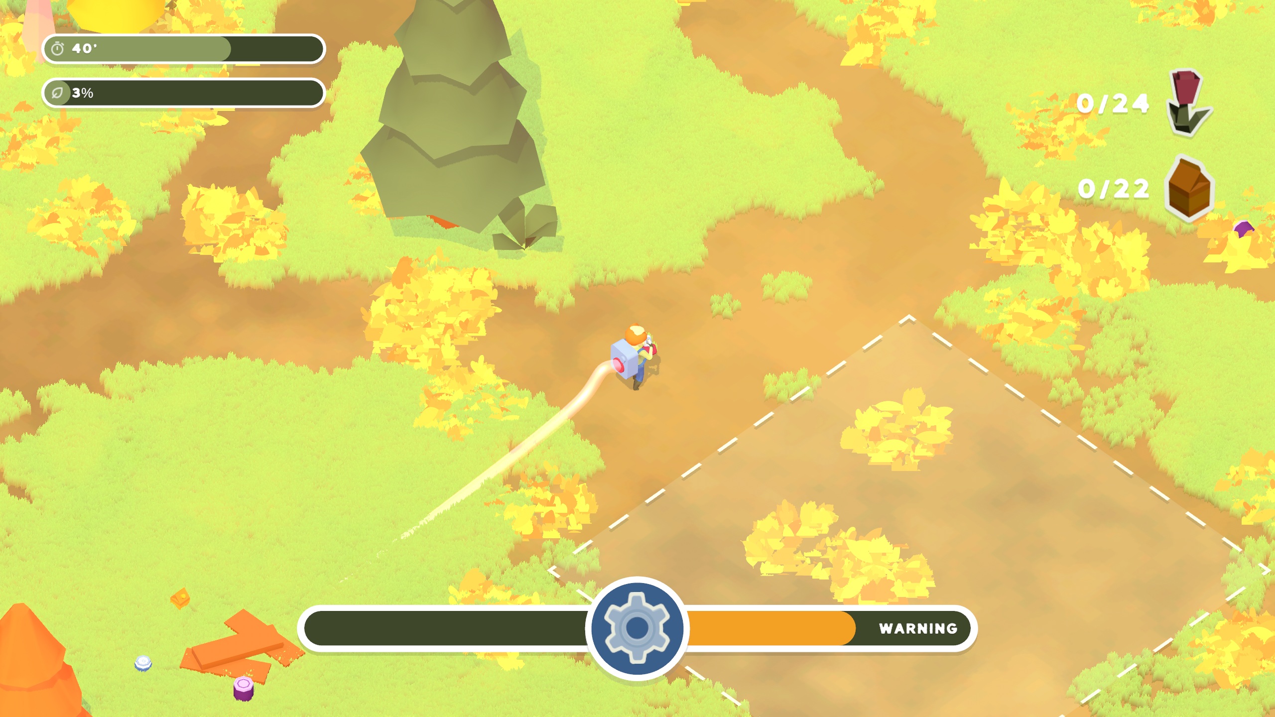 Grampa needs to clean-up his garden! Gather the leaves in the dedicated space and remove the garbage using your special leaf-blower, but PLEASE, mind the flowers, thank you very much.